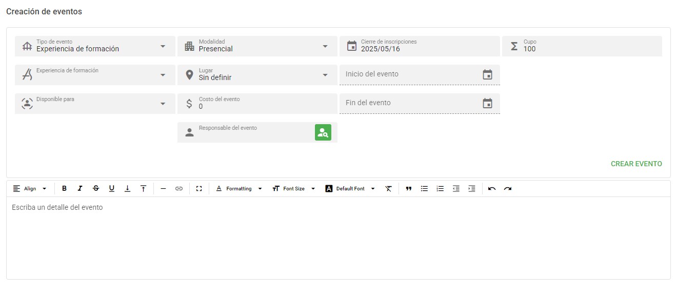 - Descripción: Al hacer clic en este botón, el evento será creado con los datos ingresados.
