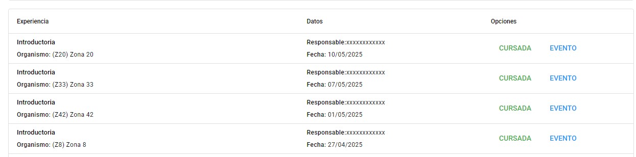 El módulo de Gestión de Experiencias permite a los usuarios gestionar las experiencias relacionadas con la formación. Los usuarios pueden aplicar filtros avanzados, visualizar las experiencias registradas, y acceder a los detalles de cada una de ellas.