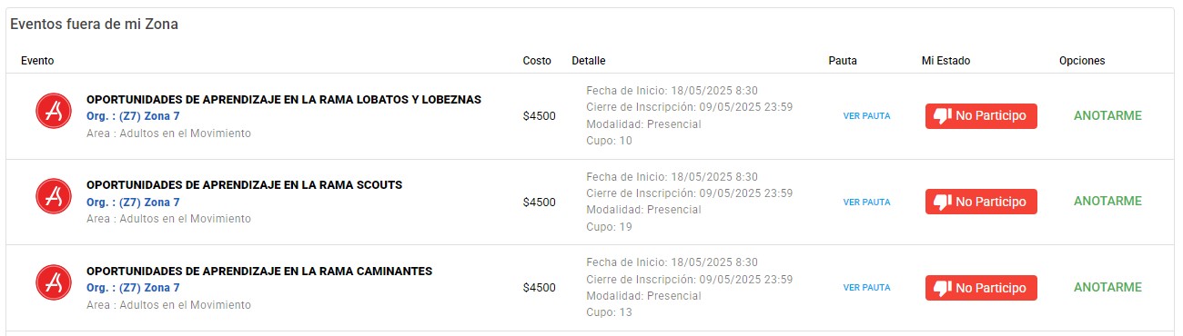 Esta sección proporciona información sobre los eventos disponibles para inscripción. Los eventos que se muestran pueden pertenecer a diferentes zonas o áreas y tienen varios detalles que te permitirán obtener información clave para decidir si deseas participar.